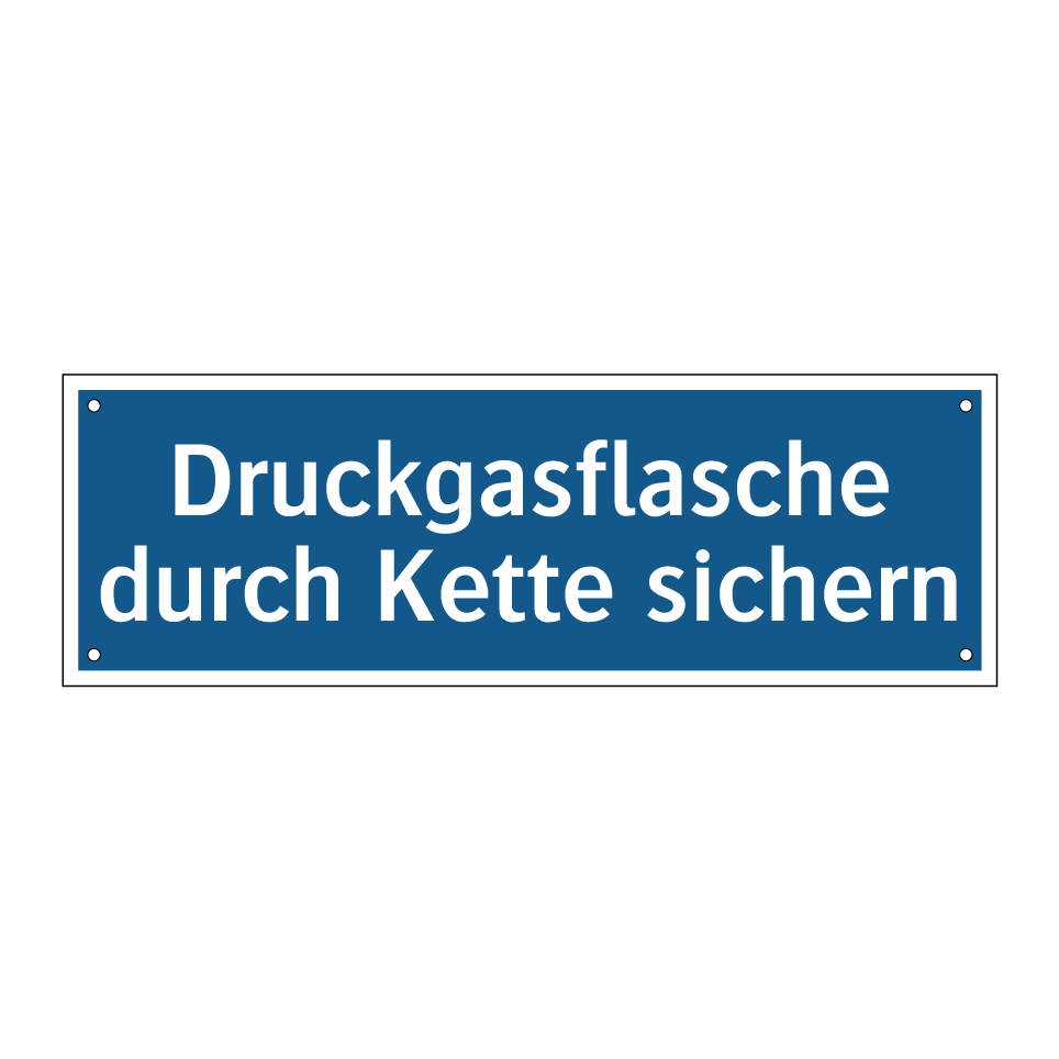 Diese Gebotsschild ist ein unverzichtbares Element für die Sicherheit in Arbeitsbereichen, in denen Druckgasflaschen verwendet werden. Es erinnert daran, dass Gasflaschen stets mit einer Kette gesichert werden müssen, um Unfälle zu vermeiden. Ideal für den Einsatz in Werkstätten, Laboren oder Lagerbereichen, wo Druckgasflaschen gelagert oder verwendet werden. Die auffällige blaue Hintergrundfarbe mit weißem Text sorgt dafür, dass die Anweisung klar und deutlich sichtbar ist. Platzieren Sie dieses Schild an gut sichtbaren Stellen, um die Einhaltung der Sicherheitsvorschriften zu gewährleisten und das Risiko von Unfällen zu minimieren.