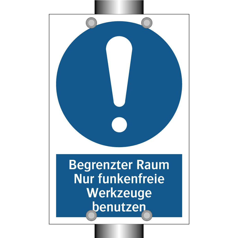 Gebotsschild mit dem Text Begrenzter Raum Nur funkenfreie Werkzeuge benutzen