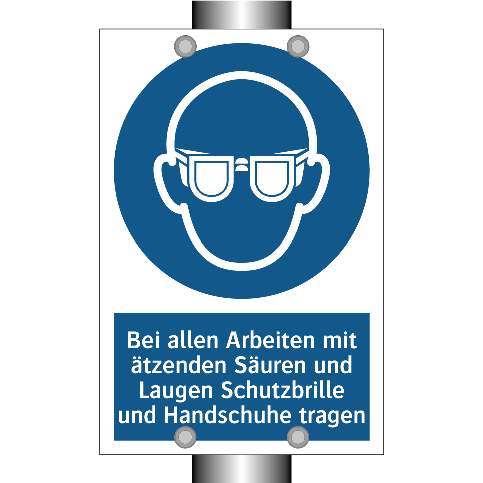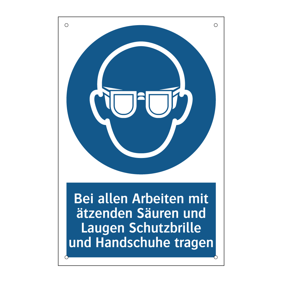 Gebotsschild mit dem Text Bei allen Arbeiten mit ätzenden Säuren und Laugen Schutzbrille und Handschuhe tragen