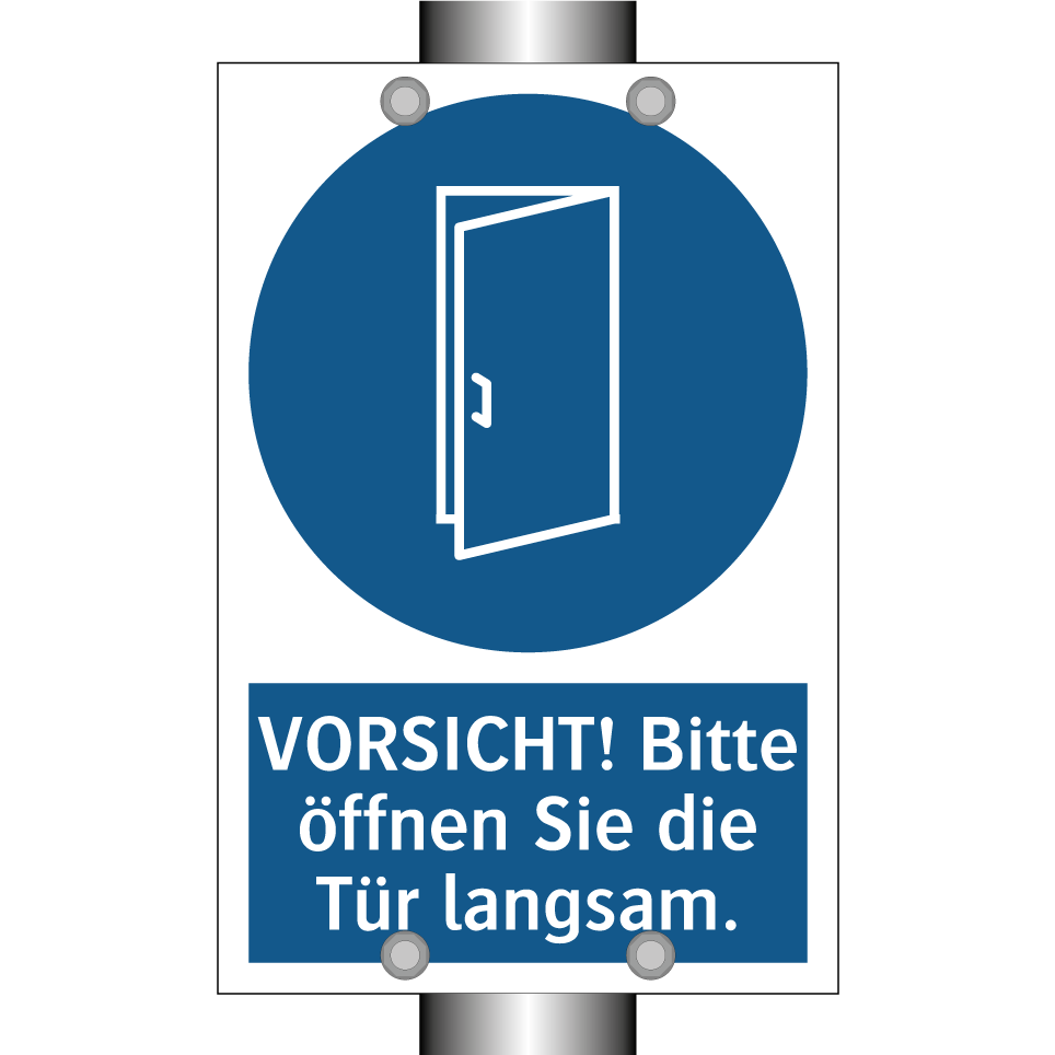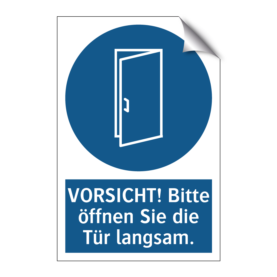 Gebotsschild mit dem Text VORSICHT! Bitte öffnen Sie die Tür langsam.