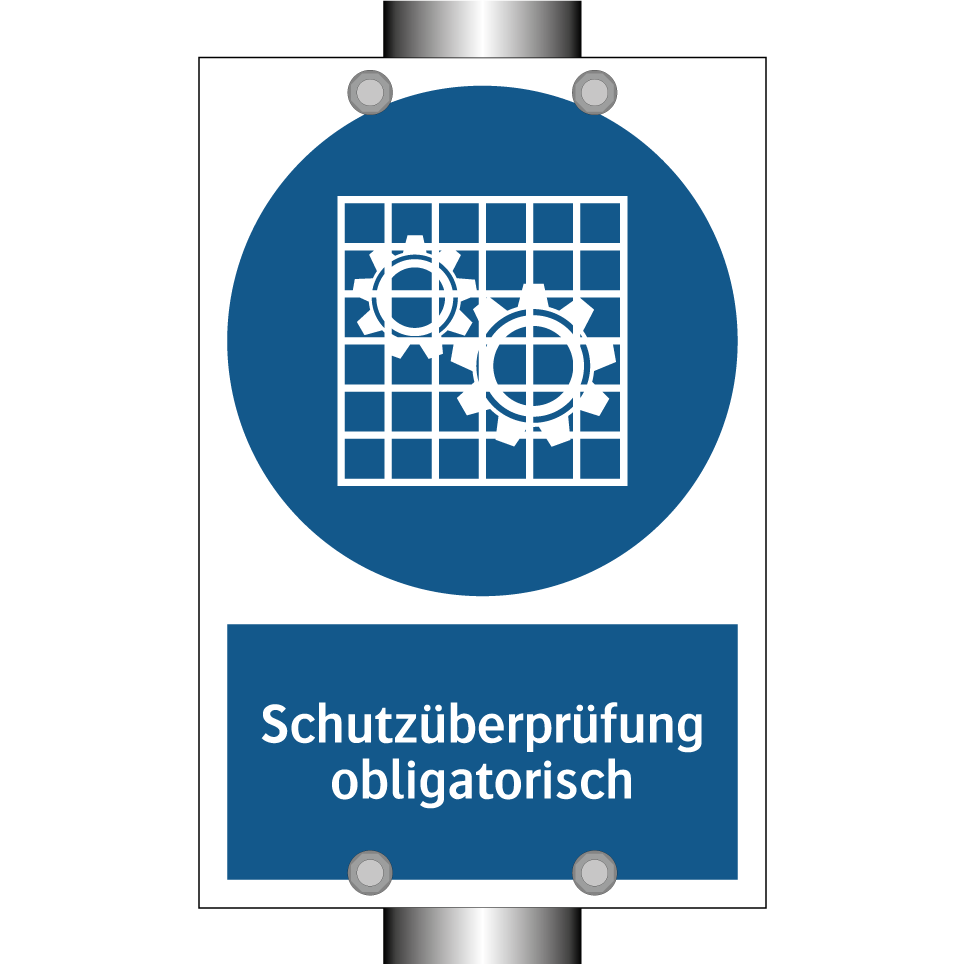 Gebotsschild mit dem Text Schutzüberprüfung obligatorisch