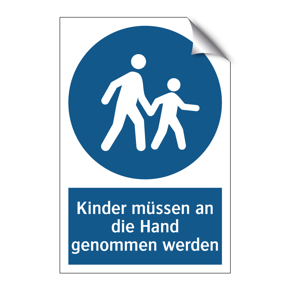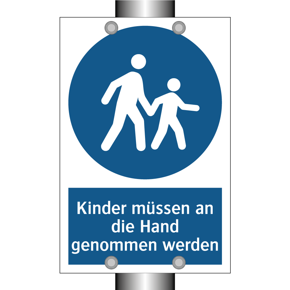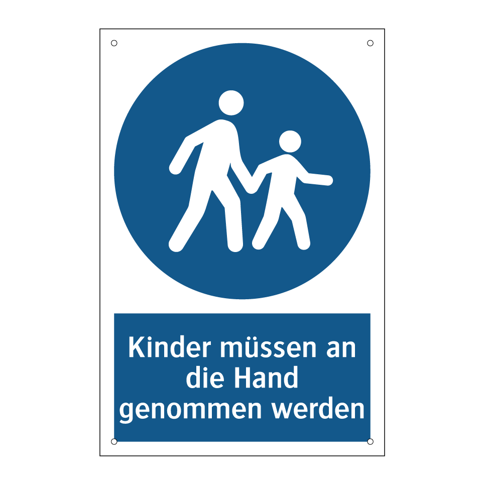 Gebotsschild mit dem Text Kinder müssen an die Hand genommen werden