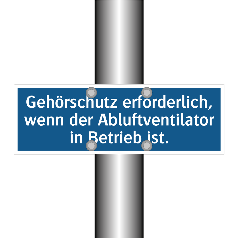 Gebotsschild mit dem Text Gehörschutz erforderlich, wenn der Abluftventilator in Betrieb ist.
