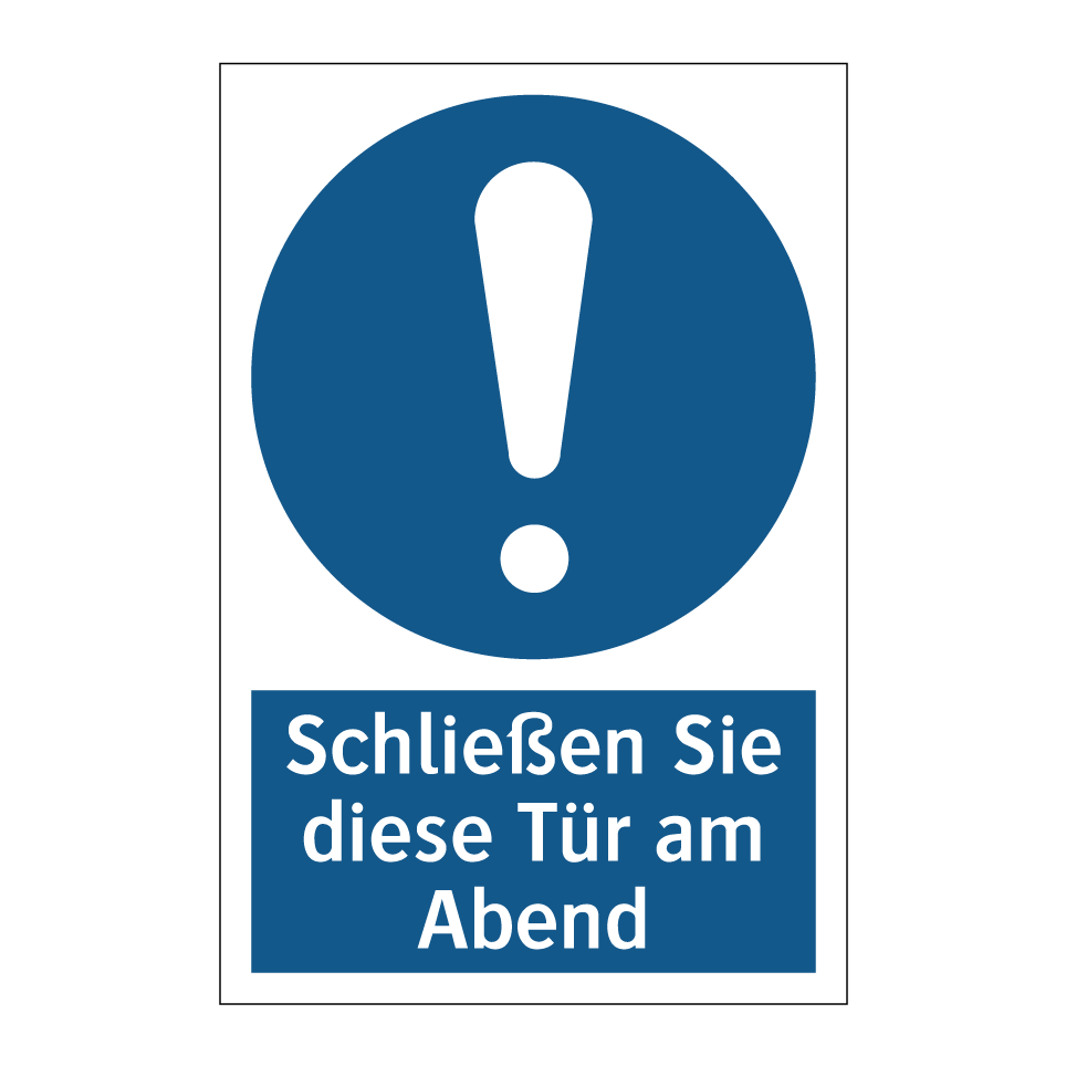 Diese Gebotsschild ist ideal für den Einsatz in Bereichen, in denen es wichtig ist, Türen am Abend zu schließen. Sie eignet sich hervorragend für Büros, Lagerhäuser und andere Arbeitsumgebungen, in denen Sicherheit und Energieeinsparung von Bedeutung sind. Die klare blaue Hintergrundfarbe und die weiße Schrift sorgen dafür, dass die Anweisung leicht erkennbar ist. Platzieren Sie diese Gebotsschild an strategischen Orten wie Eingängen oder Fluren, um sicherzustellen, dass alle Mitarbeiter und Besucher die Anweisung befolgen. Diese Gebotsschild trägt dazu bei, unbefugten Zutritt zu verhindern und die Sicherheit in Ihrem Gebäude zu erhöhen.