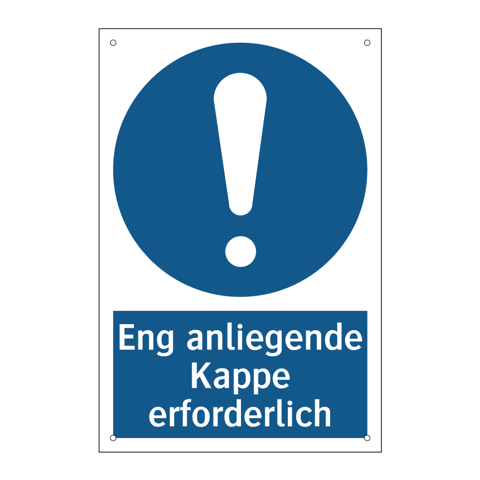 Gebotsschild mit dem Text Eng anliegende Kappe erforderlich