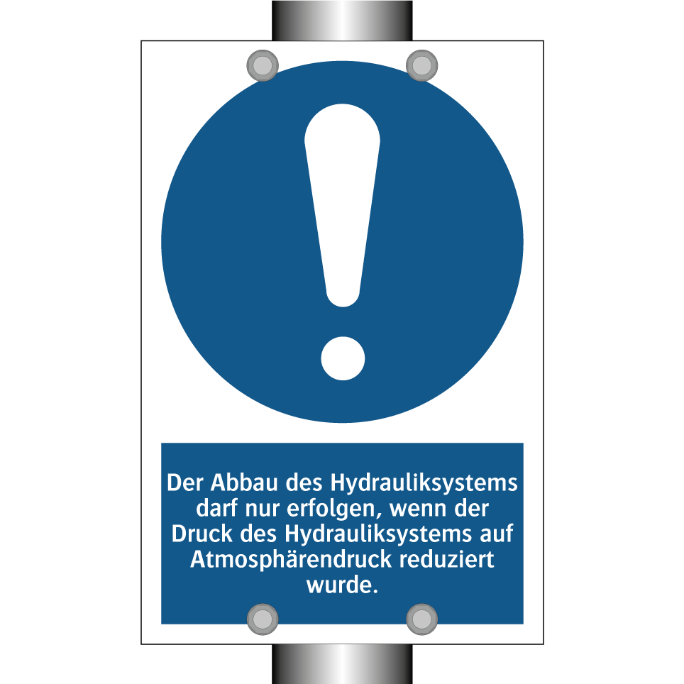 Gebotsschild mit dem Text Der Abbau des Hydrauliksystems darf nur erfolgen, wenn der Druck des Hydrauliksystems auf Atmosphärendruck reduziert wurde.