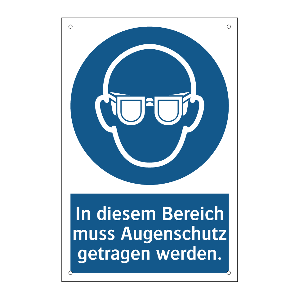 Gebotsschild mit dem Text In diesem Bereich muss Augenschutz getragen werden.