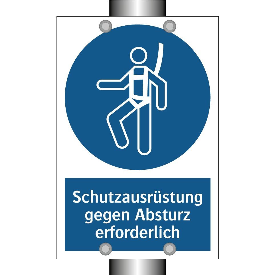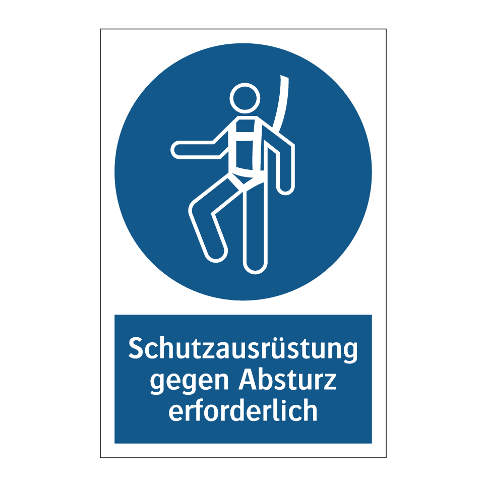 Gebotsschild mit dem Text Schutzausrüstung gegen Absturz erforderlich