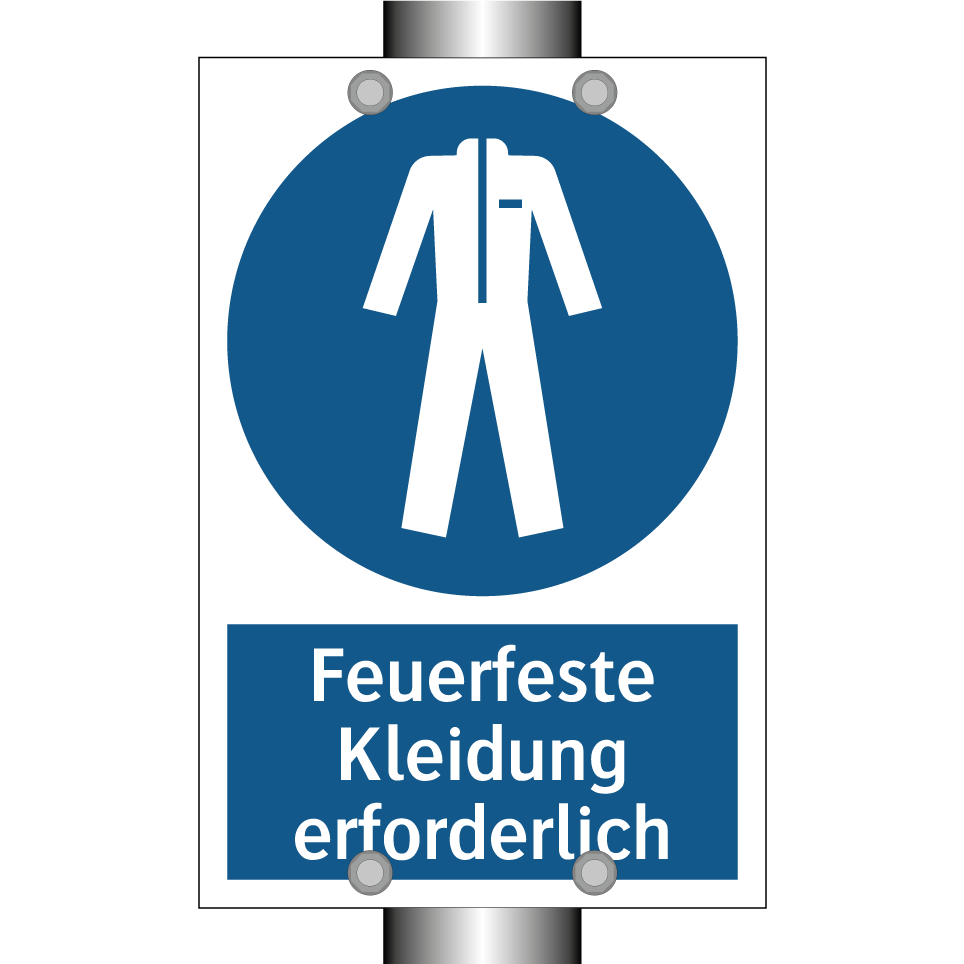 Gebotsschild mit dem Text Feuerfeste Kleidung erforderlich
