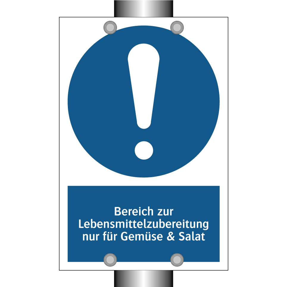 Gebotsschild mit dem Text Bereich zur Lebensmittelzubereitung nur für Gemüse & Salat