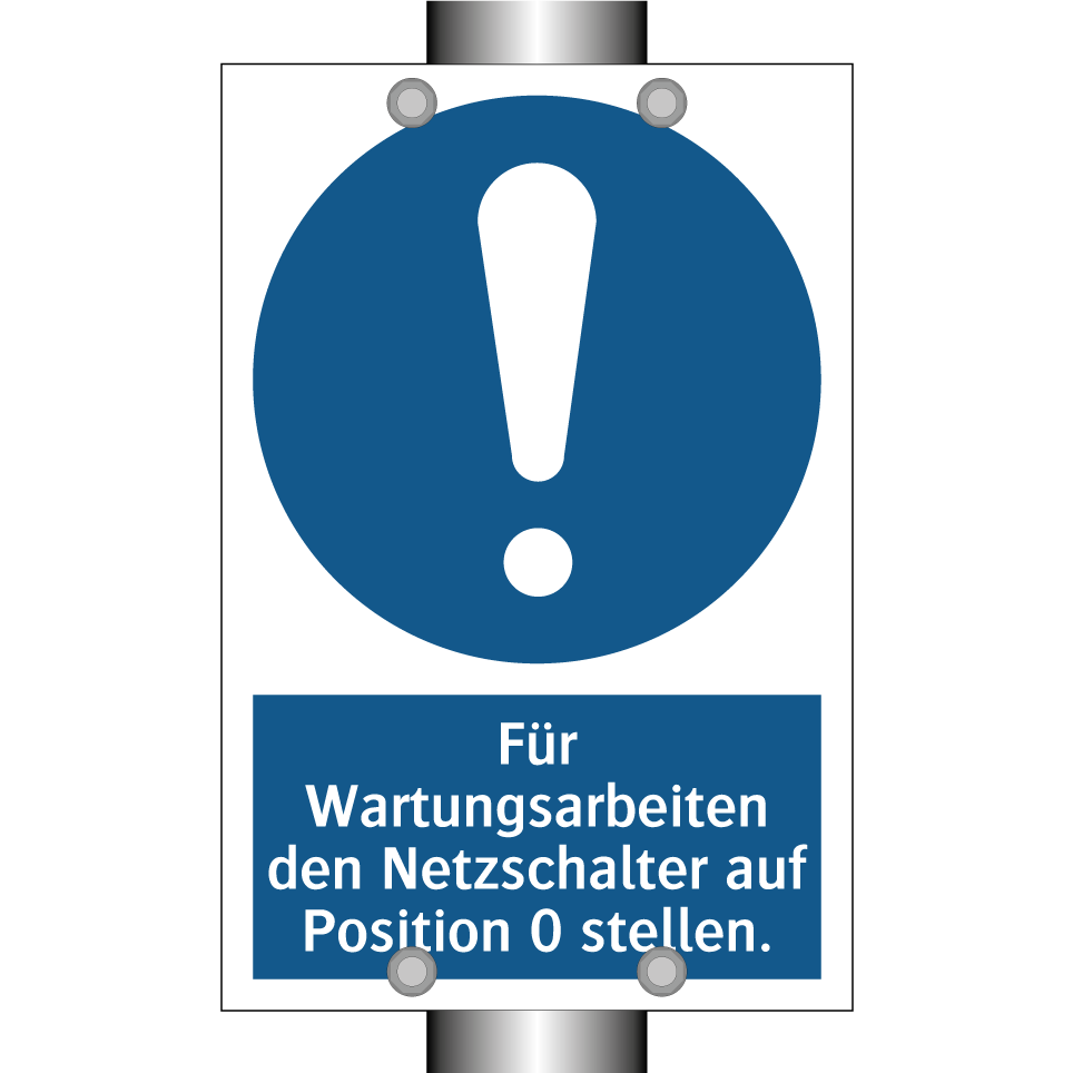 Gebotsschild mit dem Text Für Wartungsarbeiten den Netzschalter auf Position 0 stellen.
