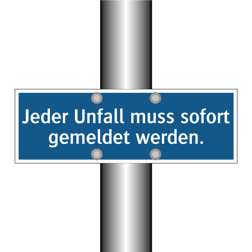 Gebotsschild mit dem Text Jeder Unfall muss sofort gemeldet werden.