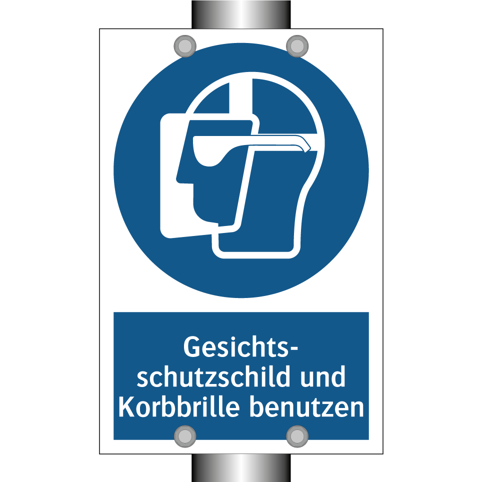Gebotsschild mit dem Text Gesichts- schutzschild und Korbbrille benutzen