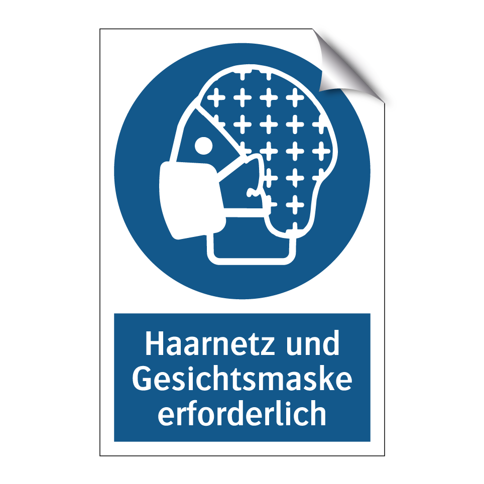 Gebotsschild mit dem Text Haarnetz und Gesichtsmaske erforderlich