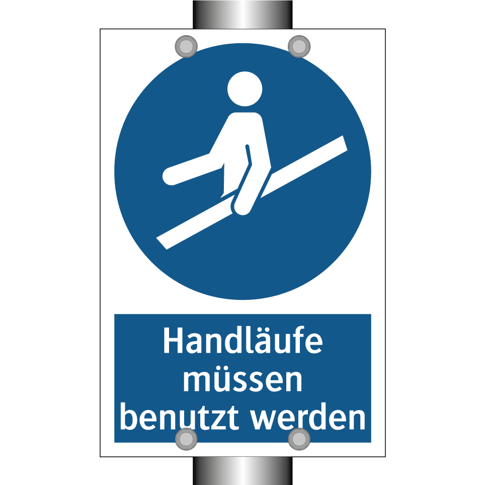 Gebotsschild mit dem Text Handläufe müssen benutzt werden