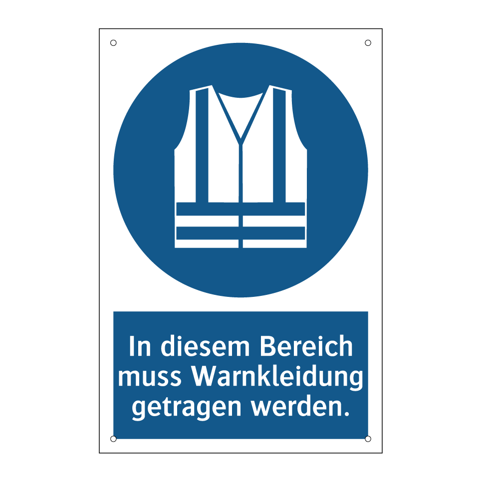 Gebotsschild mit dem Text In diesem Bereich muss Warnkleidung getragen werden.
