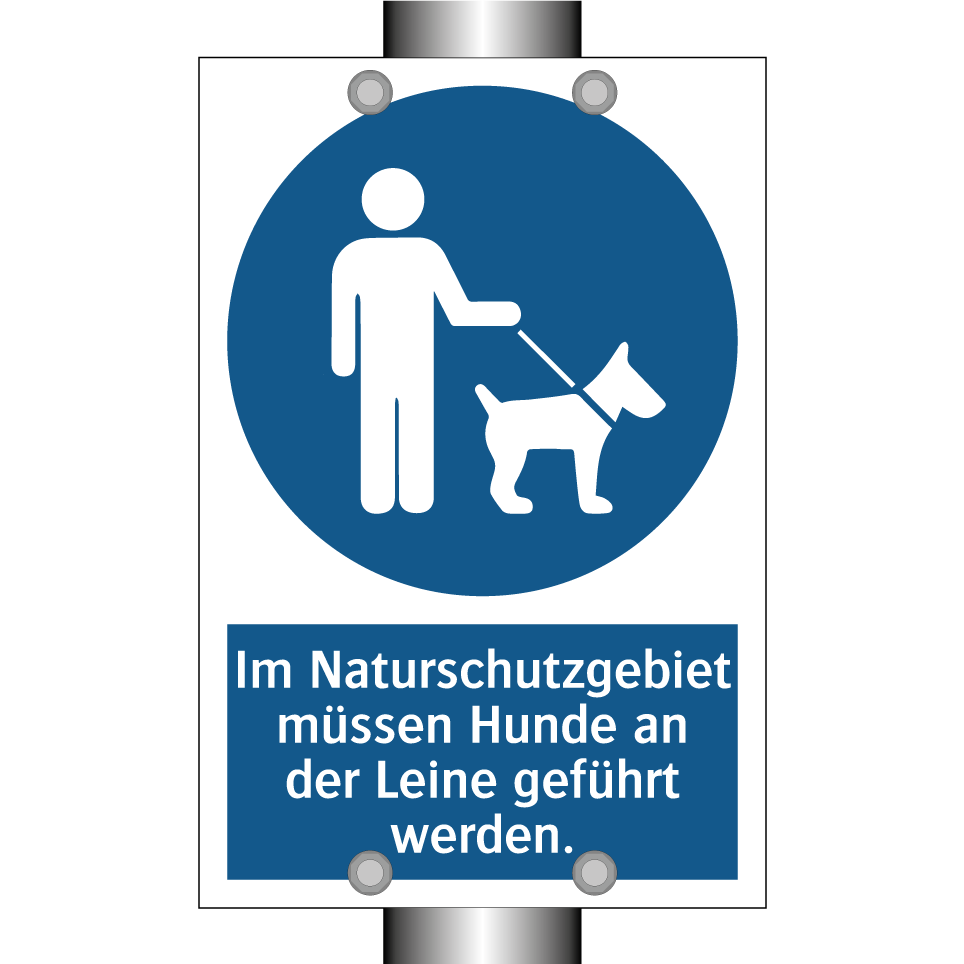 Gebotsschild mit dem Text Im Naturschutzgebiet müssen Hunde an der Leine geführt werden.