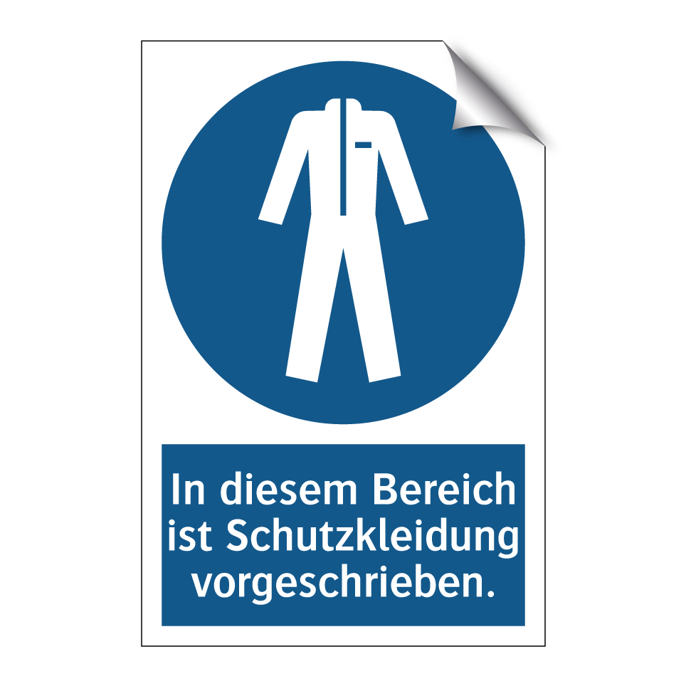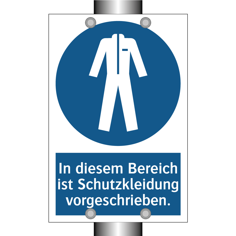 Gebotsschild mit dem Text In diesem Bereich ist Schutzkleidung vorgeschrieben.