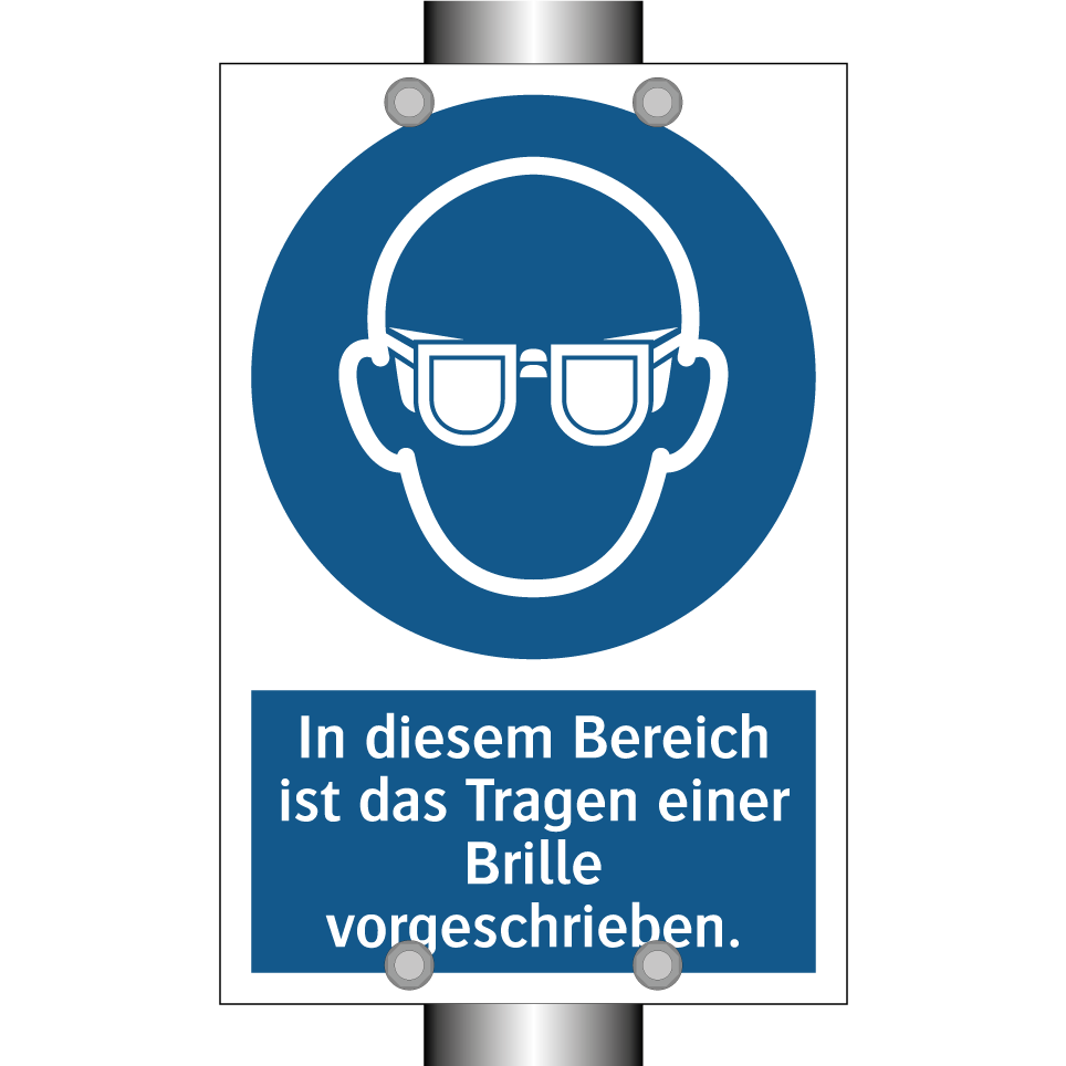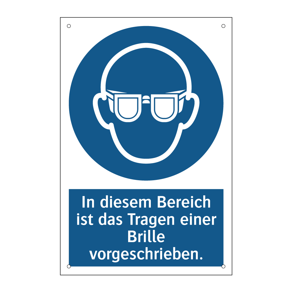 Gebotsschild mit dem Text In diesem Bereich ist das Tragen einer Brille vorgeschrieben.
