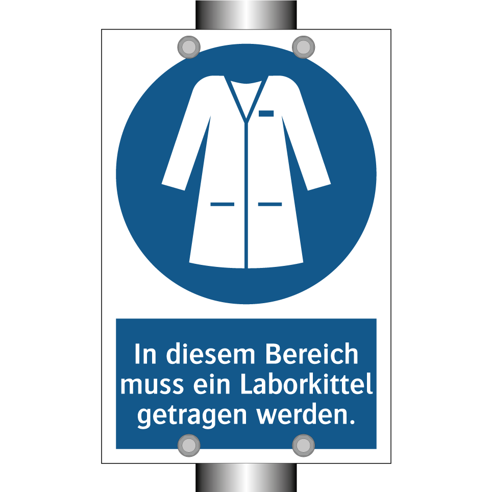 Gebotsschild mit dem Text In diesem Bereich muss ein Laborkittel getragen werden.