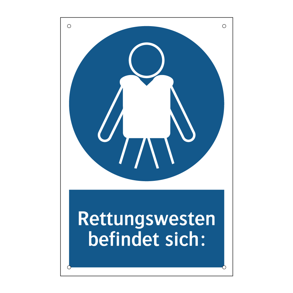 Gebotsschild mit dem Text Rettungswesten befindet sich: