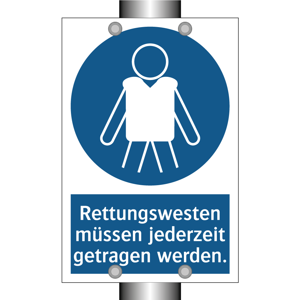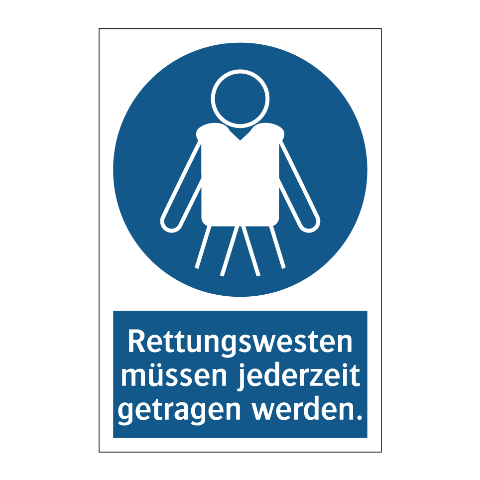 Gebotsschild mit dem Text Rettungswesten müssen jederzeit getragen werden.