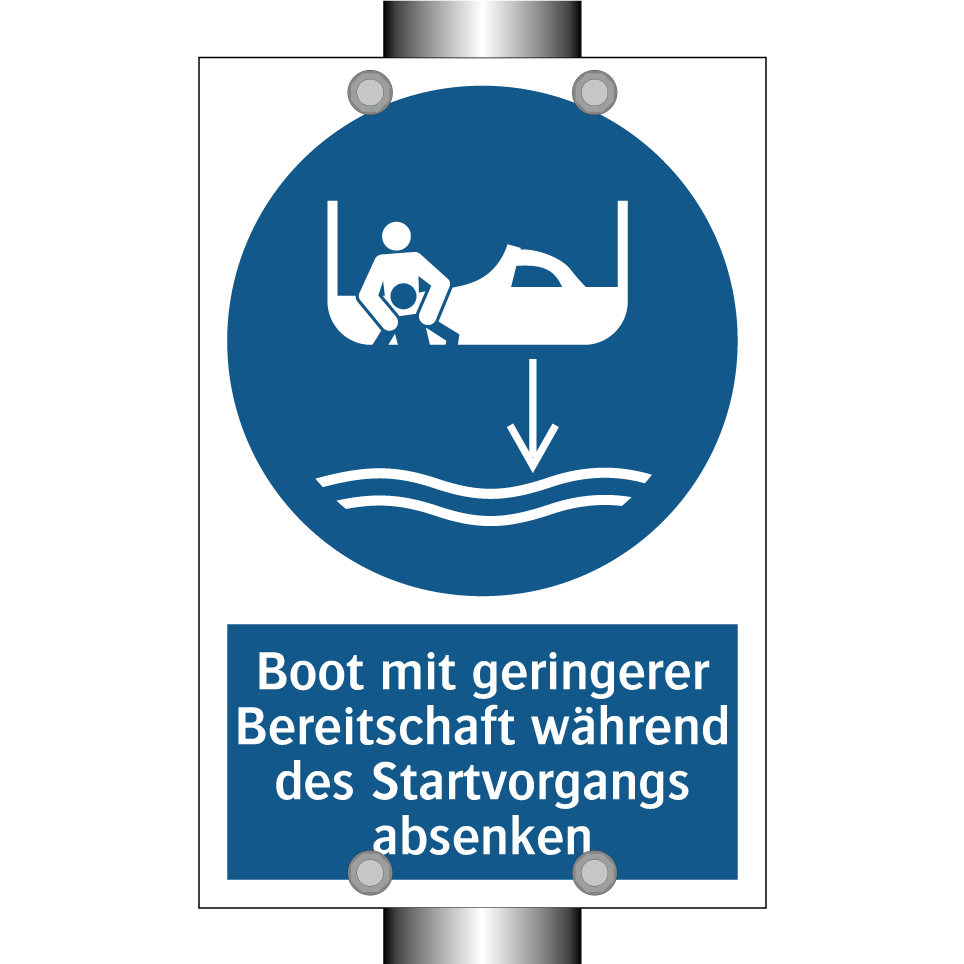 Gebotsschild mit dem Text Boot mit geringerer Bereitschaft während des Startvorgangs absenken