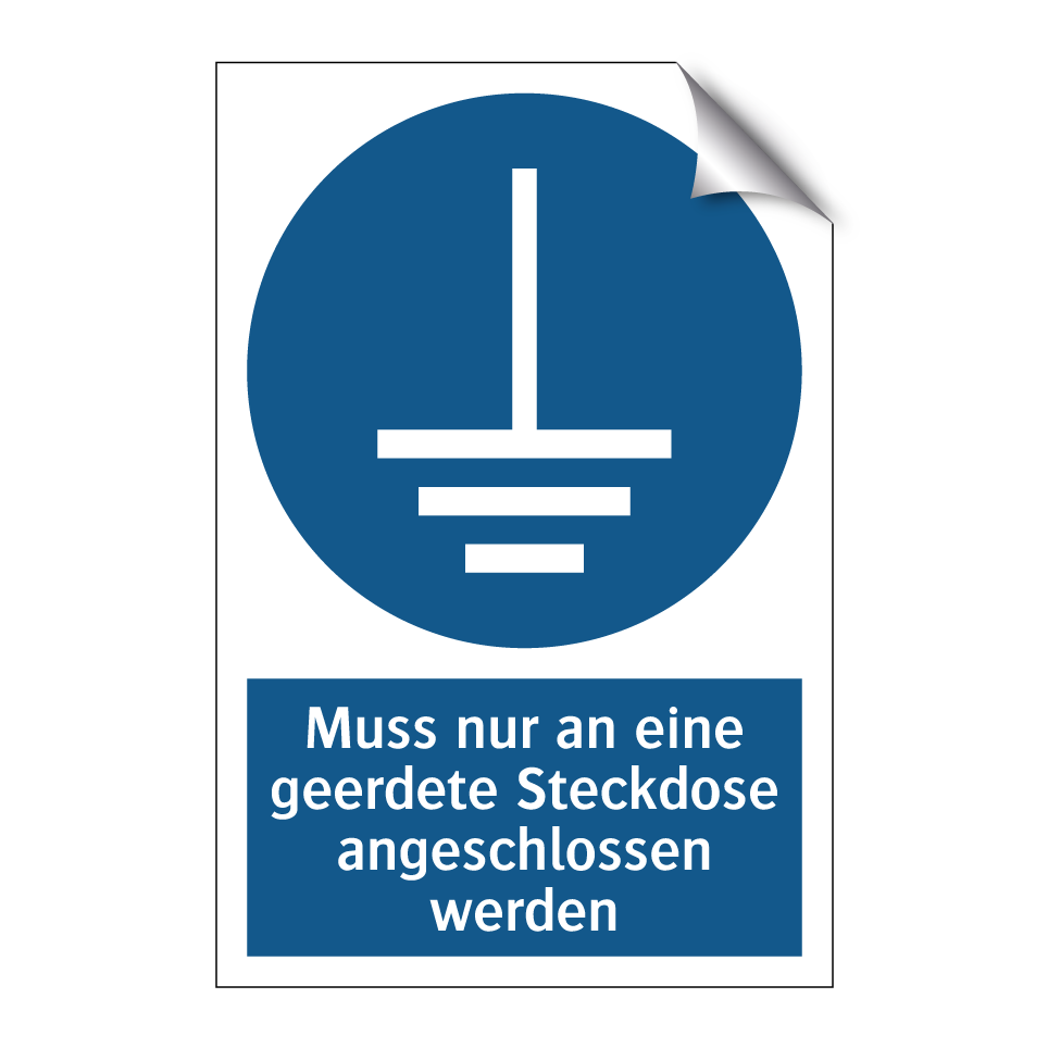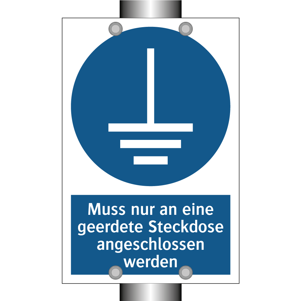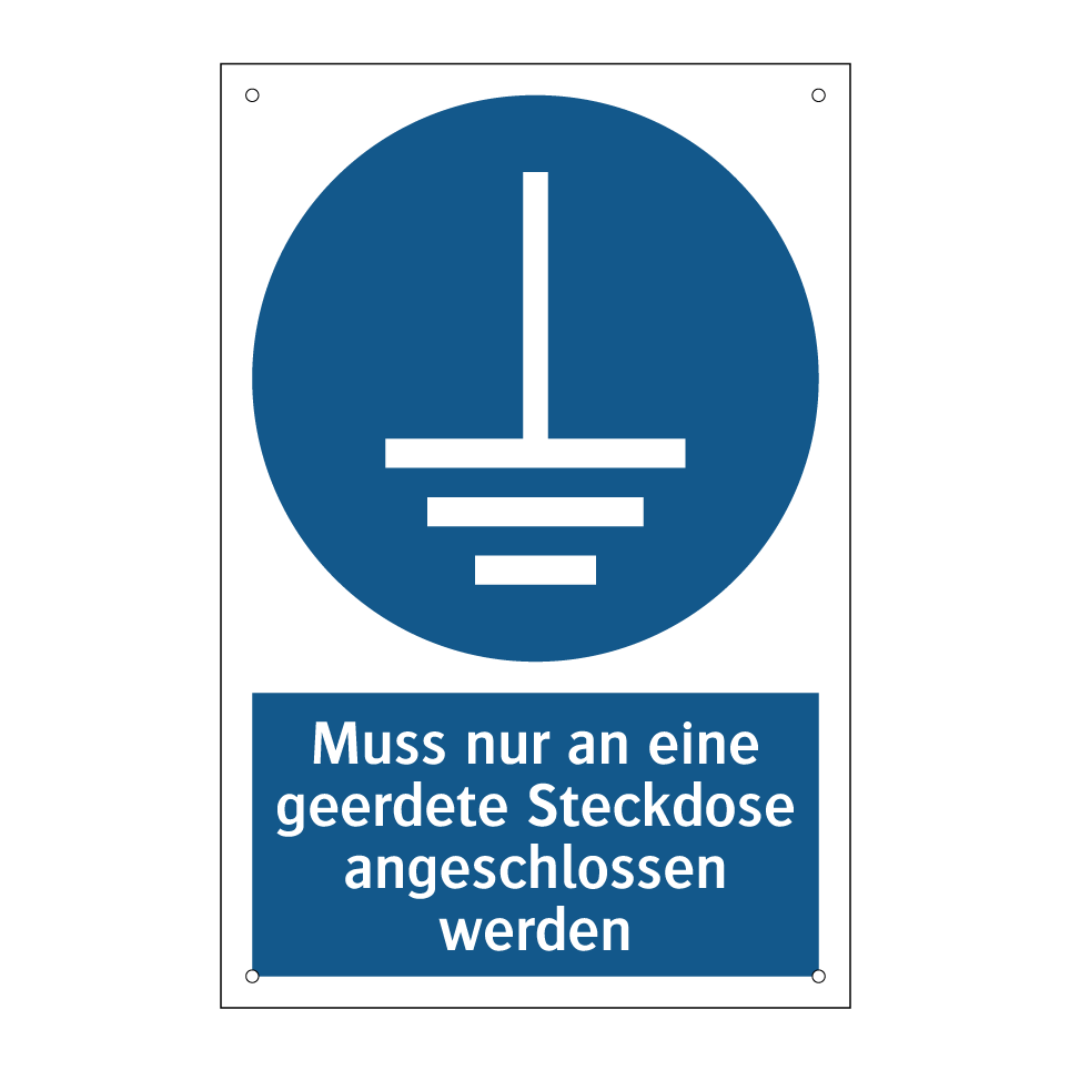 Gebotsschild mit dem Text Muss nur an eine geerdete Steckdose angeschlossen werden