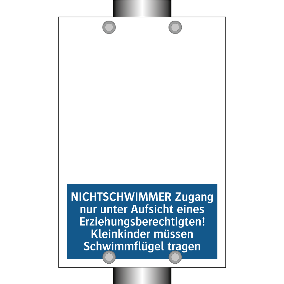 Gebotsschild mit dem Text NICHTSCHWIMMER Zugang nur unter Aufsicht eines Erziehungsberechtigten! Kleinkinder müssen Schwimmflügel tragen
