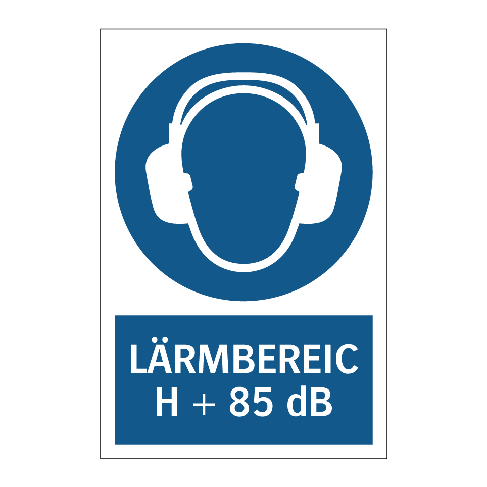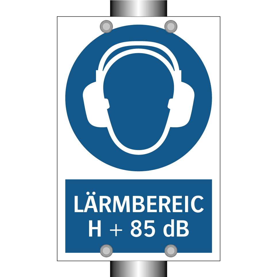 Gebotsschild mit dem Text LÄRMBEREICH + 85 dB
