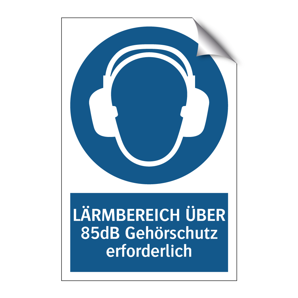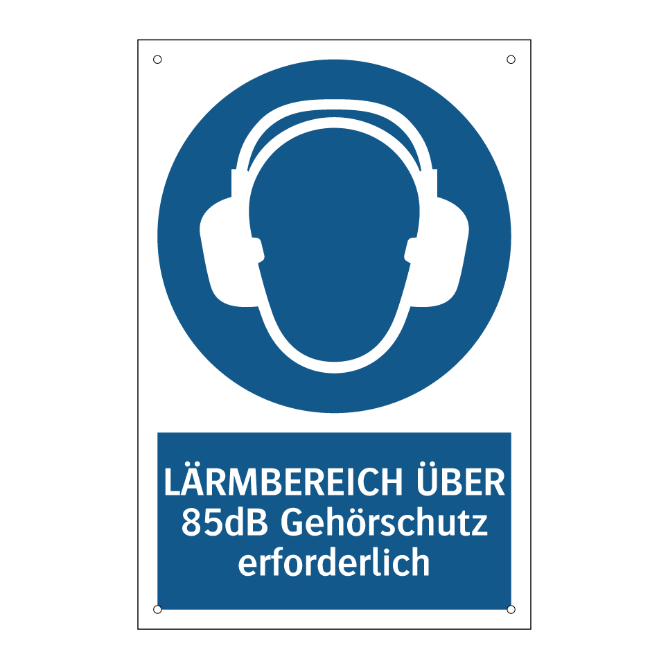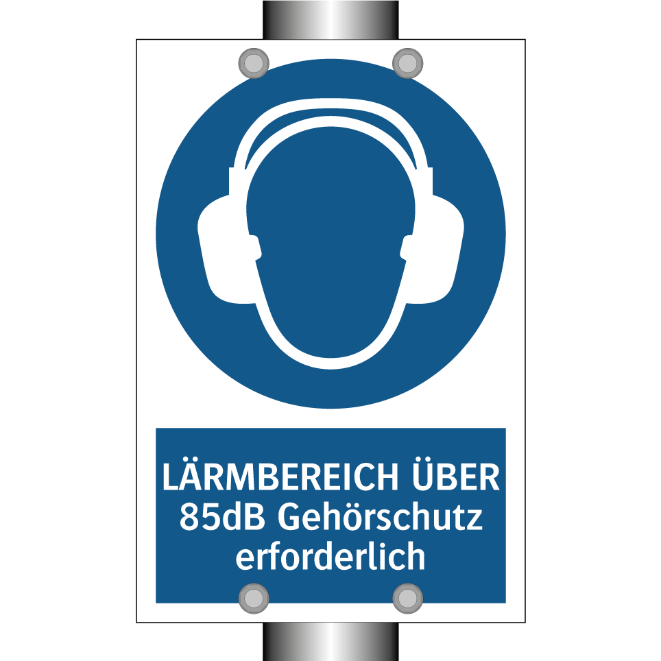 Gebotsschild mit dem Text LÄRMBEREICH ÜBER 85dB Gehörschutz erforderlich