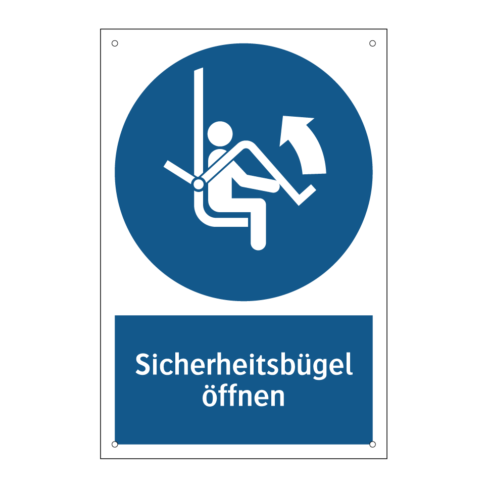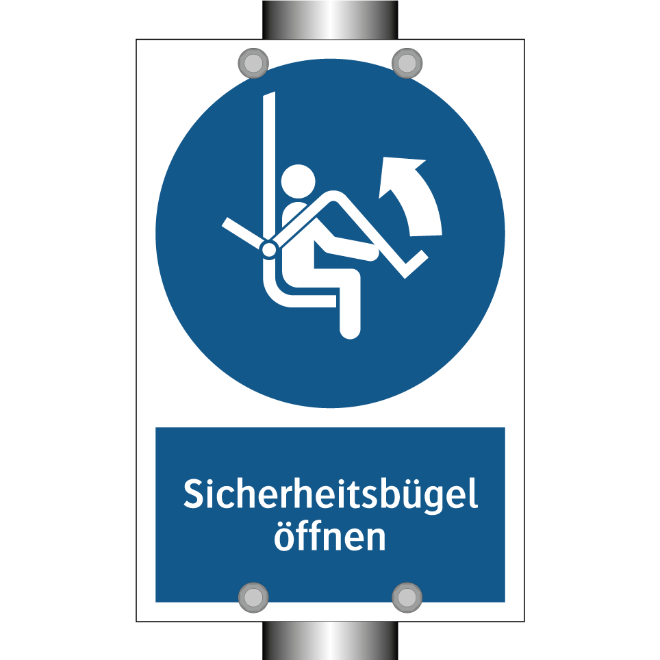 Gebotsschild mit dem Text Sicherheitsbügel öffnen