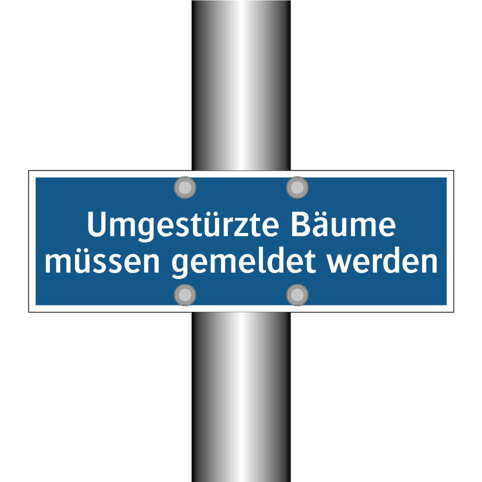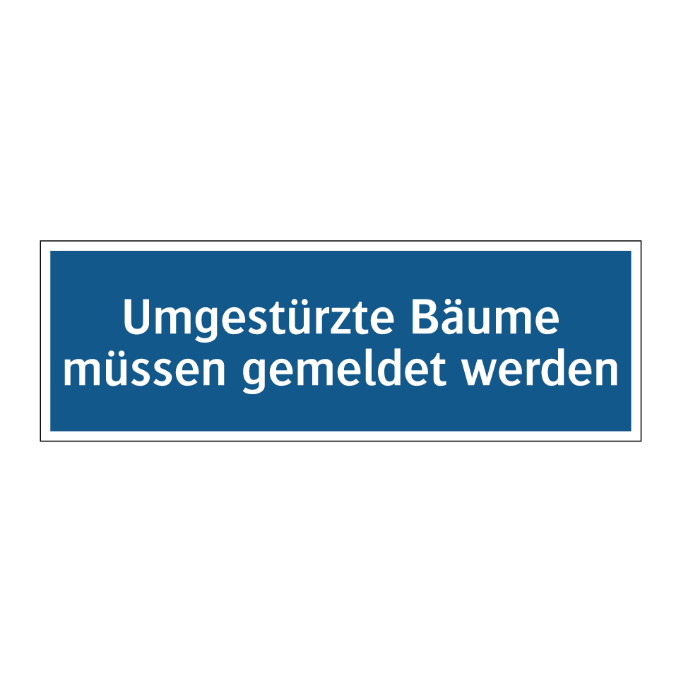 Gebotsschild mit dem Text Umgestürzte Bäume müssen gemeldet werden