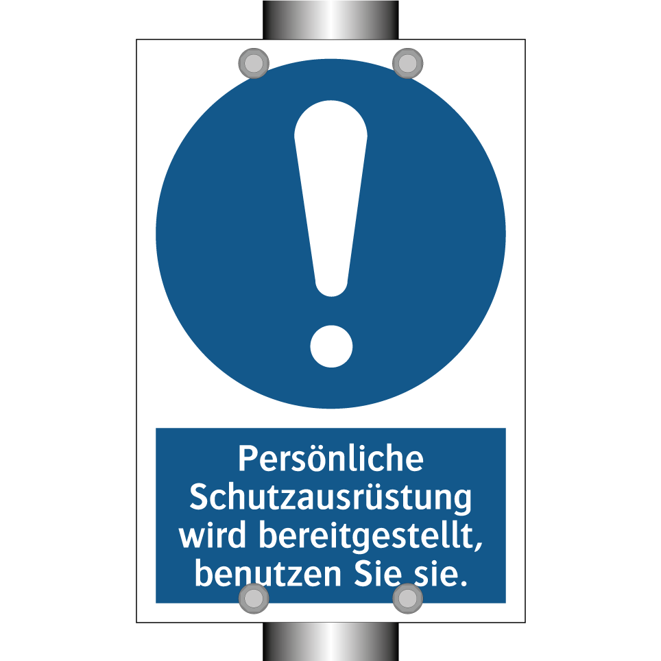 Gebotsschild mit dem Text Persönliche Schutzausrüstung wird bereitgestellt, benutzen Sie sie.