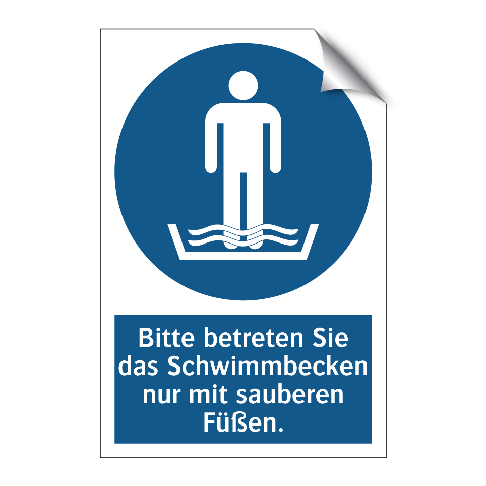 Gebotsschild mit dem Text Bitte betreten Sie das Schwimmbecken nur mit sauberen Füßen.