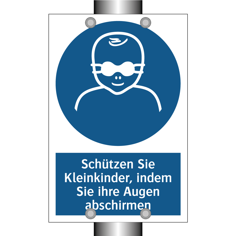 Gebotsschild mit dem Text Schützen Sie Kleinkinder, indem Sie ihre Augen abschirmen