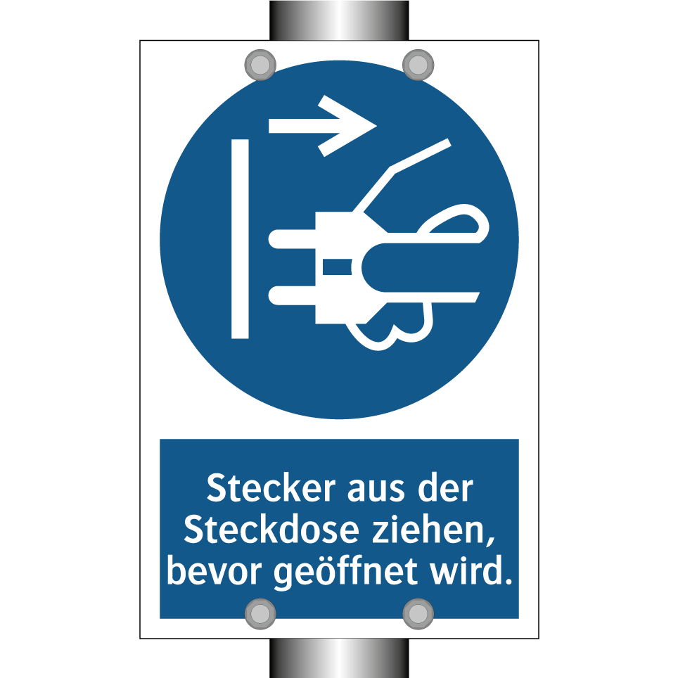 Gebotsschild mit dem Text Stecker aus der Steckdose ziehen, bevor geöffnet wird.