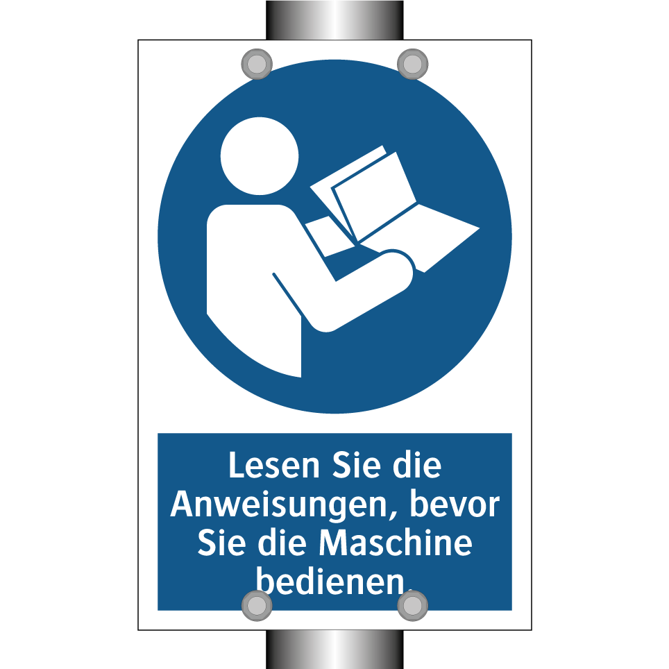 Gebotsschild mit dem Text Lesen Sie die Anweisungen, bevor Sie die Maschine bedienen.