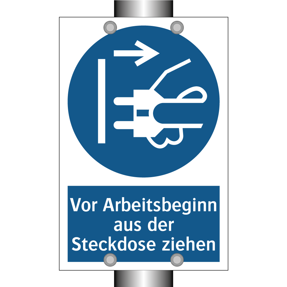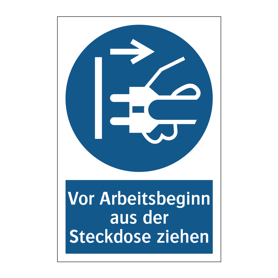 Gebotsschild mit dem Text Vor Arbeitsbeginn aus der Steckdose ziehen