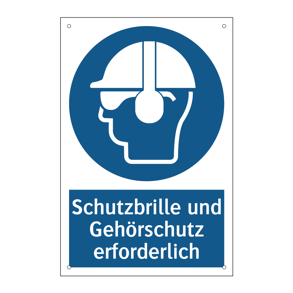 Gebotsschild mit dem Text Schutzbrille und Gehörschutz erforderlich