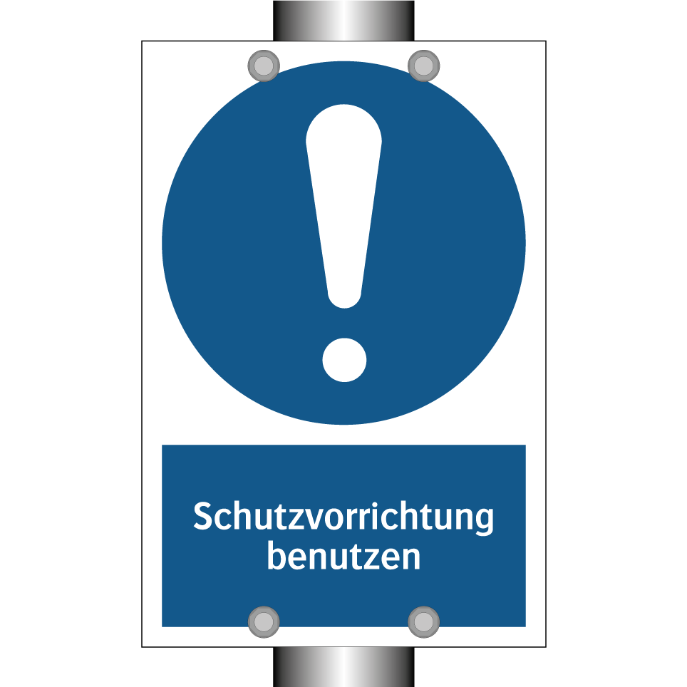 Gebotsschild mit dem Text Schutzvorrichtung benutzen