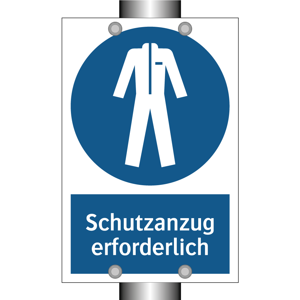 Gebotsschild mit dem Text Schutzanzug erforderlich