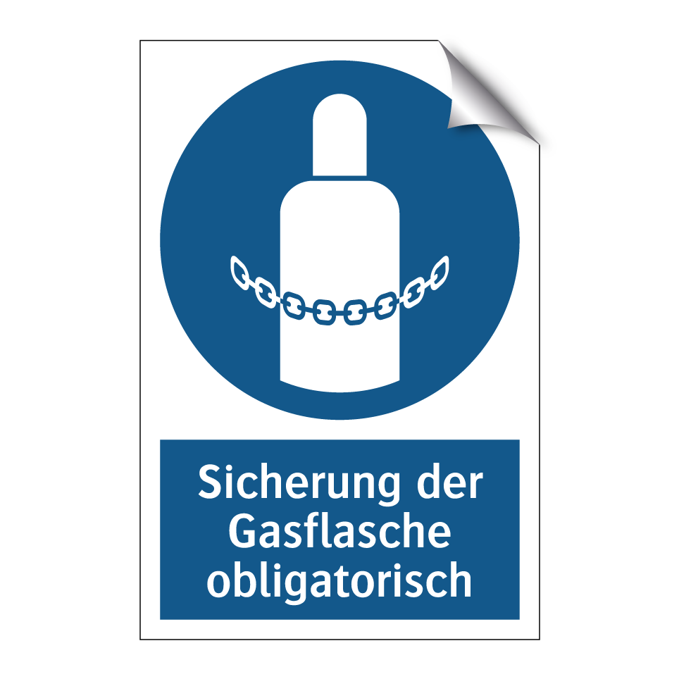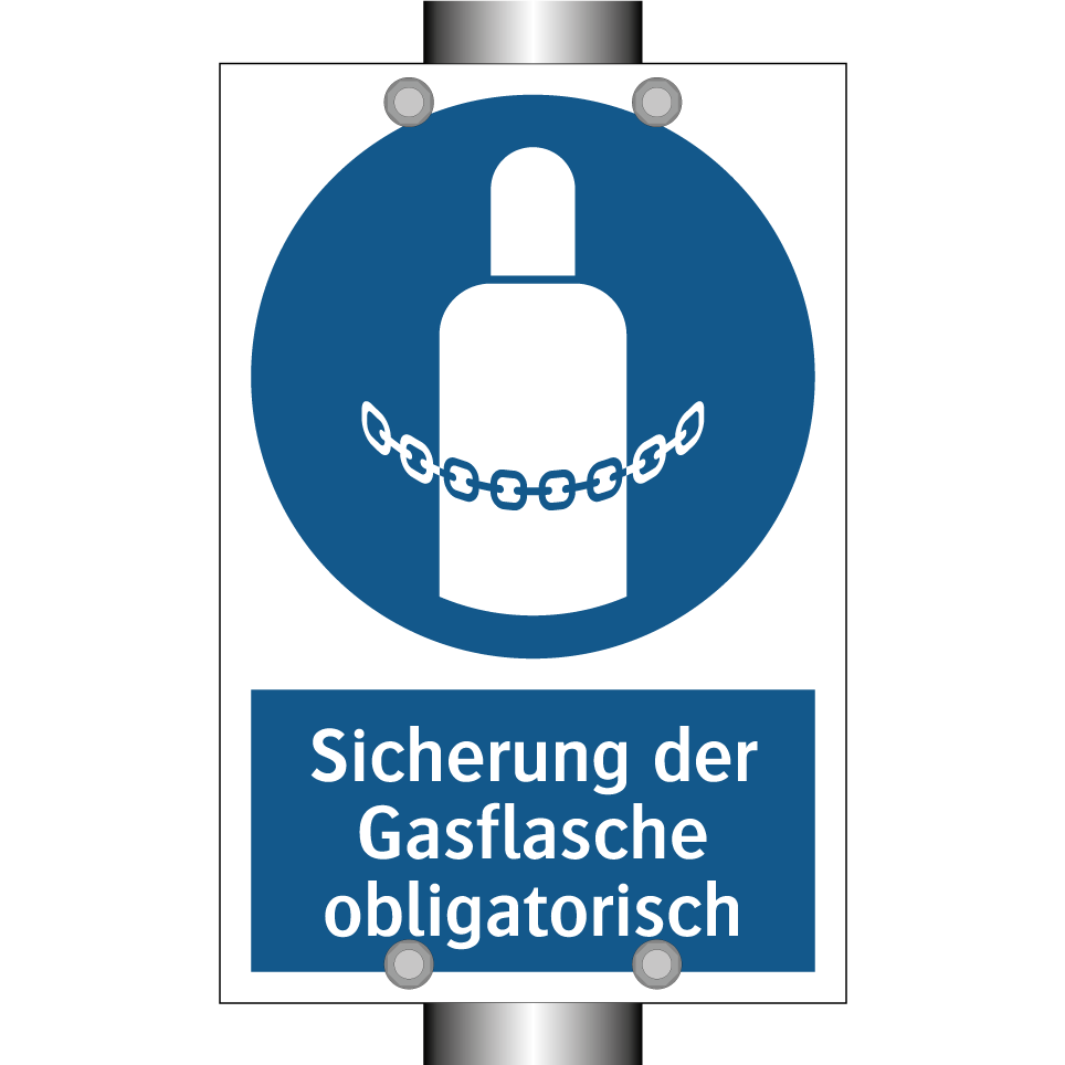 Gebotsschild mit dem Text Sicherung der Gasflasche obligatorisch
