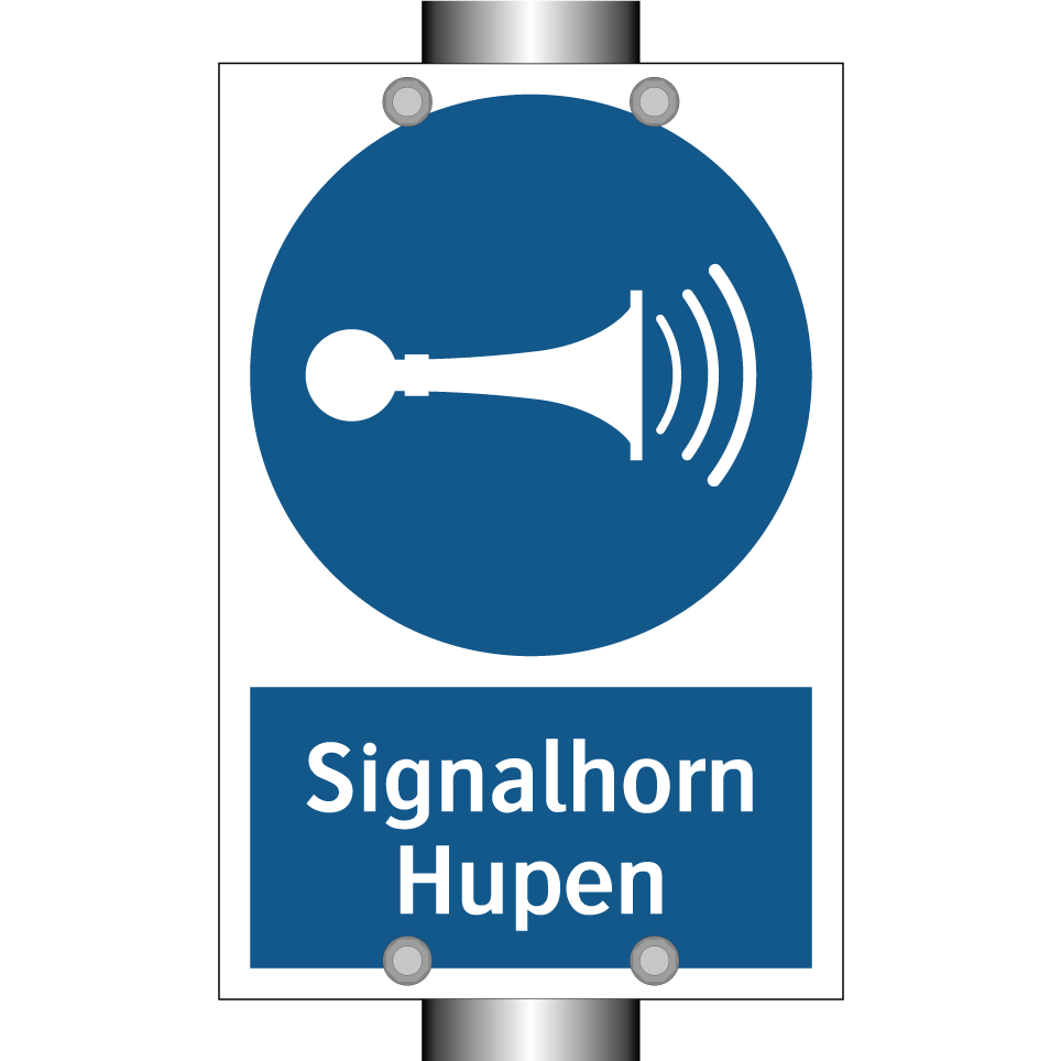 Gebotsschild mit dem Text Signalhorn Hupen