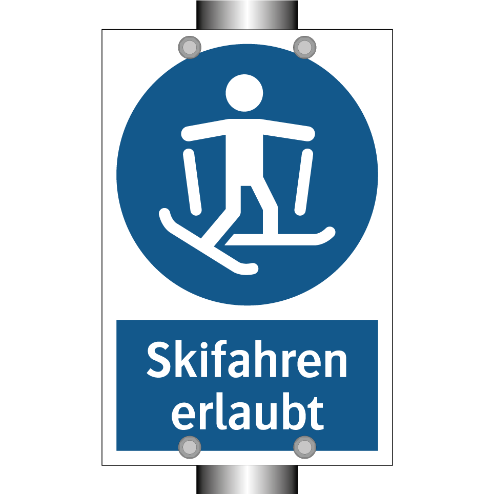 Diese Gebotsschild mit blauem Hintergrund und weißer Schrift ist ideal für Skigebiete und Wintersportorte. Sie signalisiert klar und deutlich, dass das Skifahren an diesem Ort gestattet ist. Platzieren Sie diese Gebotsschilder an den Eingängen von Skipisten, in Skiliftbereichen oder an anderen relevanten Stellen, um Skifahrern die Erlaubnis zu signalisieren. Diese Schilder sind besonders nützlich in Bereichen, in denen es wichtig ist, klare Anweisungen zu geben, um die Sicherheit und den reibungslosen Ablauf des Skibetriebs zu gewährleisten. Nutzen Sie diese visuell ansprechende und informative Beschilderung, um Missverständnisse zu vermeiden und den Skibetrieb effizient zu gestalten.