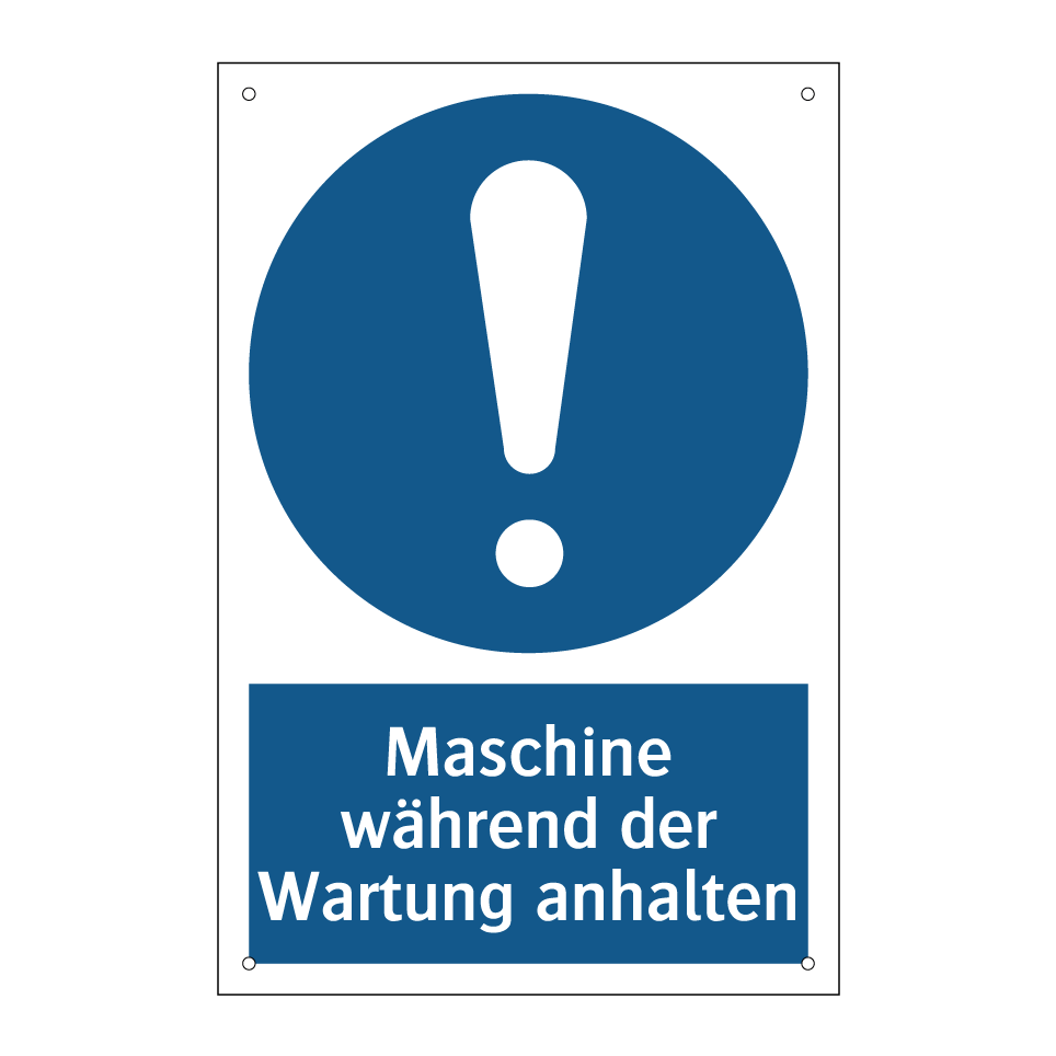 Gebotsschild mit dem Text Maschine während der Wartung anhalten