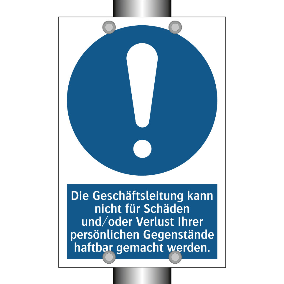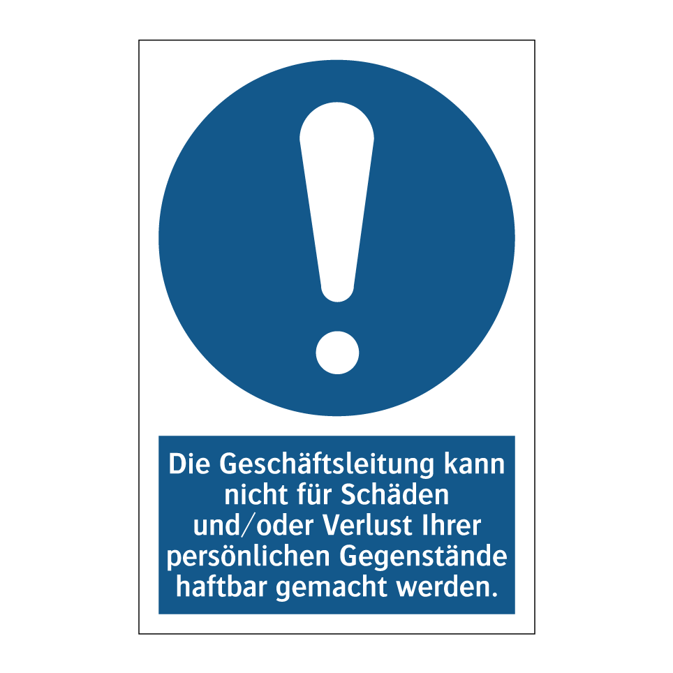 Gebotsschild mit dem Text Die Geschäftsleitung kann nicht für Schäden und/oder Verlust Ihrer persönlichen Gegenstände haftbar gemacht werden.