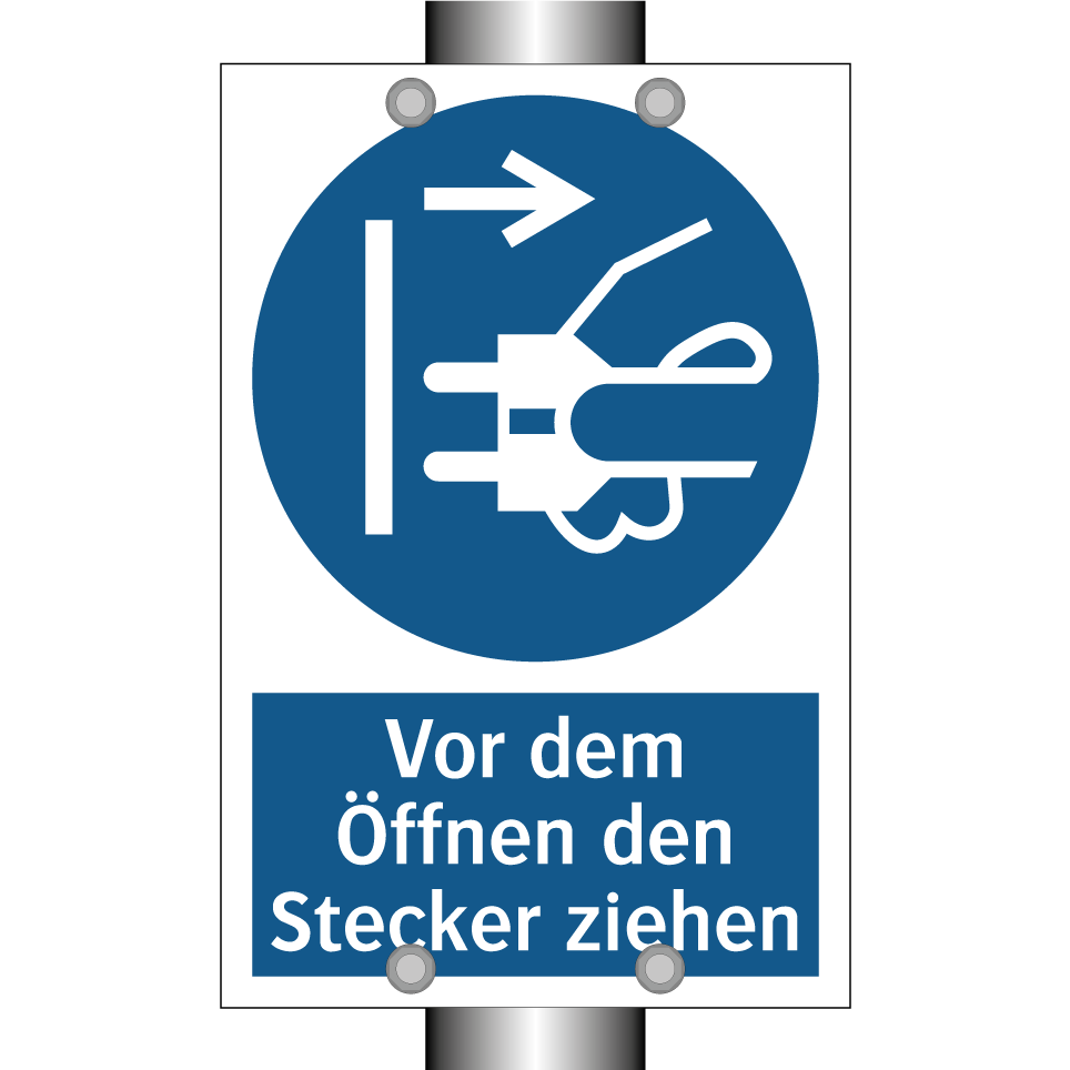 Gebotsschild mit dem Text Vor dem Öffnen den Stecker ziehen