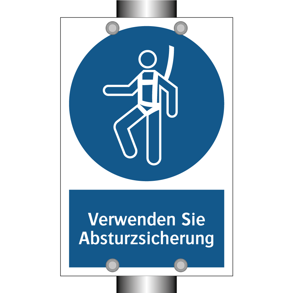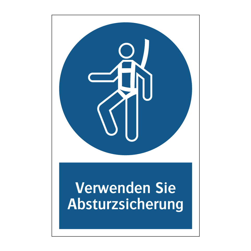 Gebotsschild mit dem Text Verwenden Sie Absturzsicherung