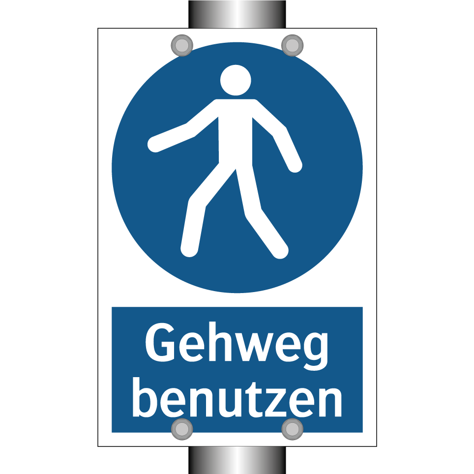 Diese Gebotsschild mit blauem Hintergrund und weißer Schrift ist ideal für die klare Kommunikation von Sicherheitsanweisungen. Sie fordert Fußgänger auf, den Gehweg zu benutzen, und trägt so zur Sicherheit im Straßenverkehr bei. Diese Gebotsschilder sind besonders nützlich in städtischen Gebieten, an Baustellen oder in Bereichen mit hohem Verkehrsaufkommen, wo es wichtig ist, den Fußgängerverkehr zu lenken. Platzieren Sie das Schild an gut sichtbaren Stellen, um sicherzustellen, dass die Anweisung von allen Passanten beachtet wird. Es ist ein unverzichtbares Element für die Gewährleistung der Sicherheit und Ordnung in öffentlichen und privaten Bereichen.